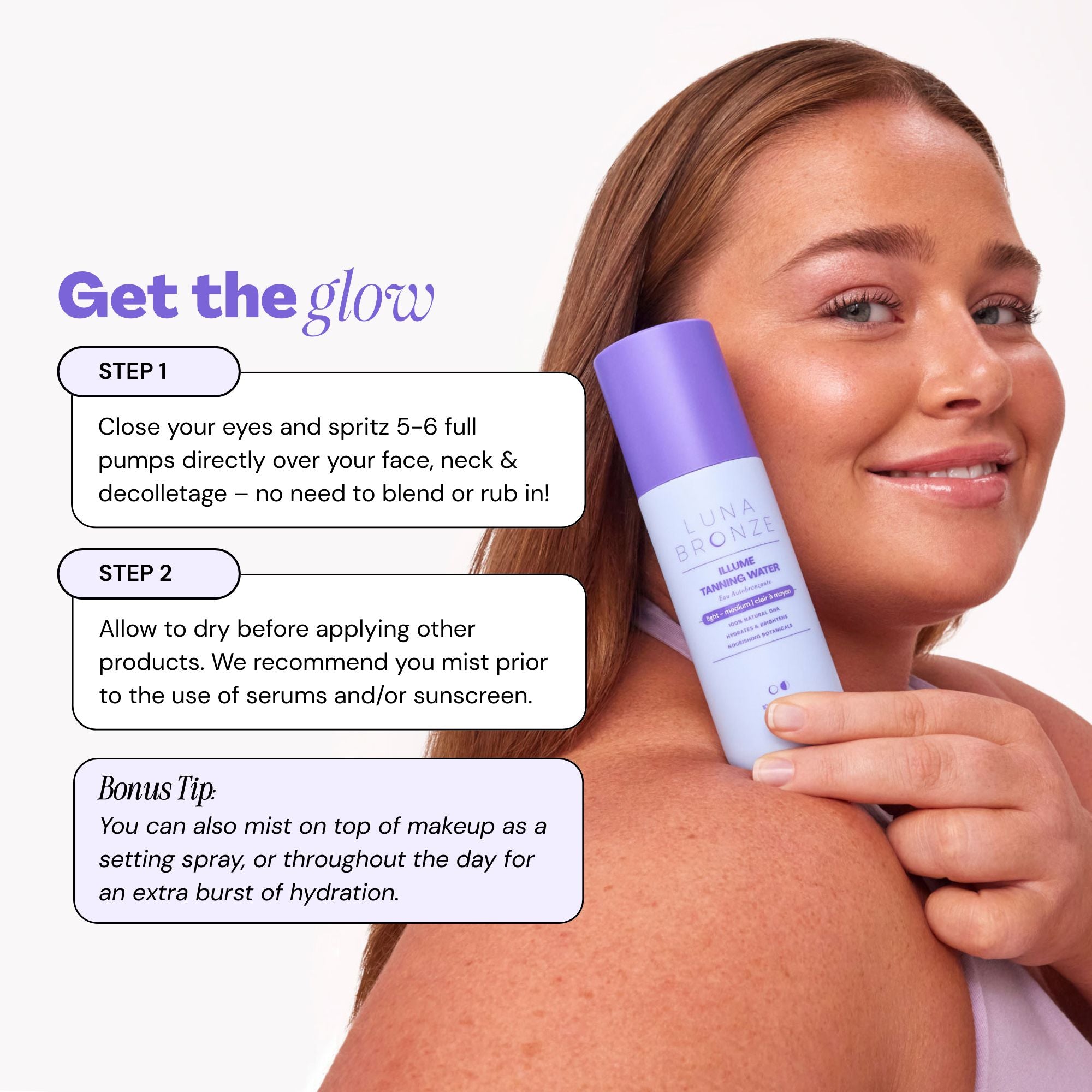 Illume Tanning Water is perfect for a light, buildable glow. This hydrating, refreshing formula applies effortlessly via mist application, and develops gradually for a natural finish. Ideal for those who prefer a low maintenance approach, Illume Tanning Water is enriched with skin-nourishing ingredients like aloe vera and rose water to leave your skin feeling hydrated and radiant. Simply spritz it onto a clean, dry face, or you use our Contour Blending Brush to buff it in. It’s the perfect choice for a subtle, everyday glow.