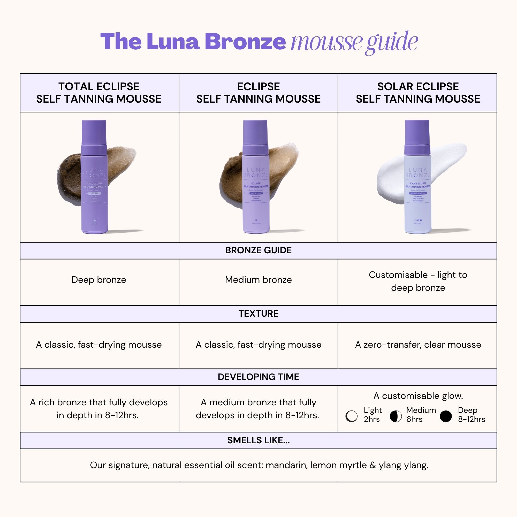 - Select your favourite Luna Bronze Tanning Mousse: either Eclipse Tanning Mousse or Total Eclipse Tanning Mousse will be suited best due to the colour guide.